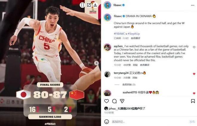 “中国队击败了裁判+日本+美国队,中国男篮全队都是本土球员,FIBA应该调查这场吹罚离谱的裁判”